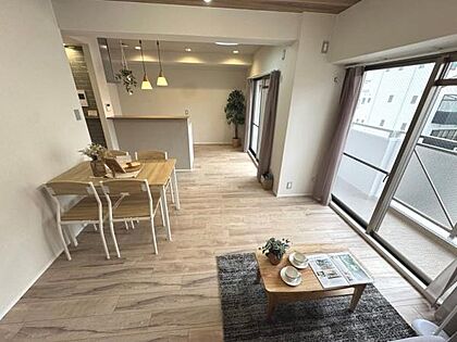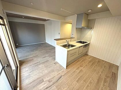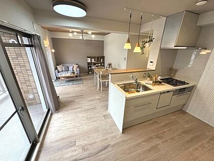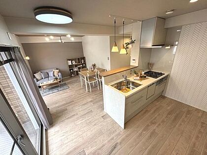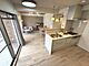 広々としたリビングとキッチンが一体感のある空間を演出しています。木目調のフローリングが温かみを感じさせます。大きな窓から自然光がたっぷり入り明るさが魅力です。対面キッチンで開放感のある印象です。