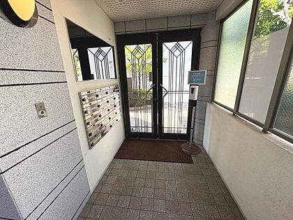 日当たりの良さを感じるエントランスです。ガラス扉が開放感を演出しています。集合ポストがすっきりと設置されています。衛生面を意識した消毒液も設置されています。