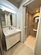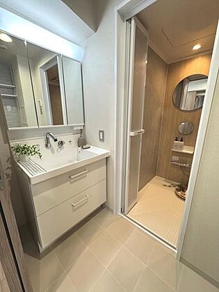 三面鏡付きの洗面台があり収納スペースも確保されています。浴室との動線がスムーズな配置です。清潔感のある内装で明るい照明が特徴的です。機能性と使い勝手を意識した洗面所です。
