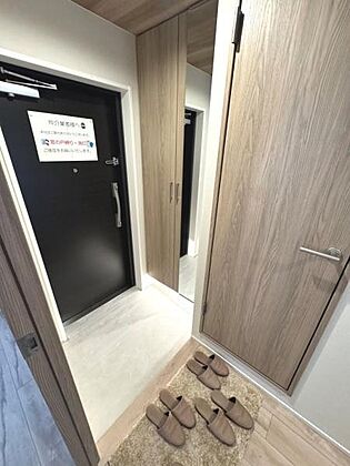 玄関は明るい色合いの床材と天井が使われており全体的に落ち着いた雰囲気です。廊下が玄関から一直線に続き奥行きを感じられます。収納スペースも確保されているのですっきりと使えます。