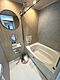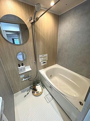 明るい照明とナチュラルな木目調パネルが清潔感を演出しています。浴槽まわりにゆとりがあり使いやすい空間です。ワイドな鏡と手すりが設置されているため機能性にも配慮されています。