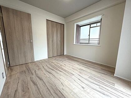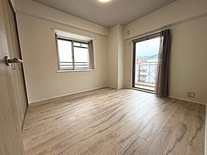 窓が2ヶ所あり室内が明るく開放的な洋室です。木目調のフローリングが落ち着いた雰囲気を演出しています。収納スペース付きでお部屋をすっきり使えます。バルコニーへの出入りも便利な設計です。