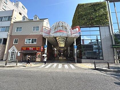 アーケードの入口が印象的な商店街で利便性の高さが感じられる立地です。周辺には飲食店もあり日常の利用がしやすい雰囲気です。ガラス張りの建物や壁面緑化も目を引きます。日差しが明るく開放感のあるエリアです。