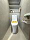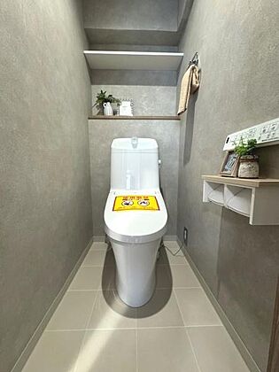 落ち着いた色合いの壁と床で清潔感のある空間です。壁面収納棚が設置されており整理にも便利です。温水洗浄便座が搭載され操作パネルも見やすい位置にあります。