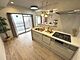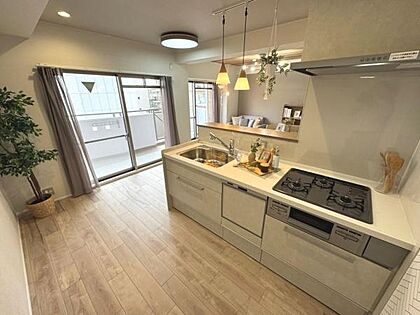 明るい空間に調和するシンプルでモダンなキッチンです。使いやすいワークトップと収納が特徴です。清潔感のあるデザインが印象的です。キッチン全体が広く見渡せる配置となっています。