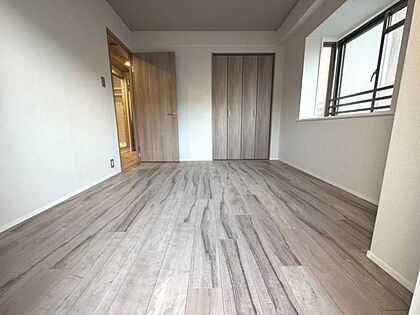 明るい光が差し込む洋室です。ナチュラルなフローリングが空間を広く感じさせます。すっきりとした壁面でインテリアも合わせやすいです。シンプルなデザインで使い勝手の良いお部屋です。