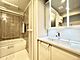 三面鏡の付いたゆったりとした洗面化粧台。合わせ鏡で後ろのスタイリングも楽ちんです。鏡の後ろは収納になっているので、細々したものを収納でき、スッキリとした洗面周りになります。