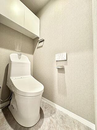 新規交換のトイレはウォシュレット搭載で使用後はスッキリ爽快。上部に物入もあるので便利です!