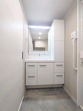 【 独立洗面化粧台 】フラットで掃除もしやすい洗面化粧台完備三面鏡のため身だしなみのチェックもバッチリ!