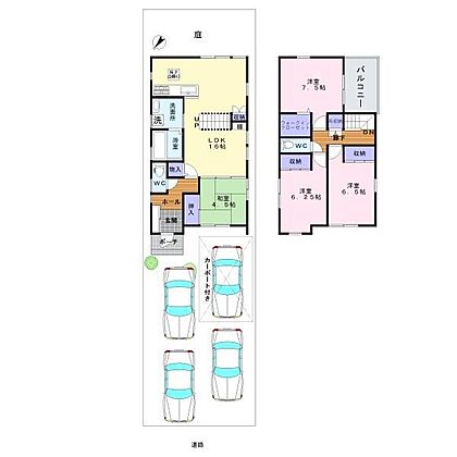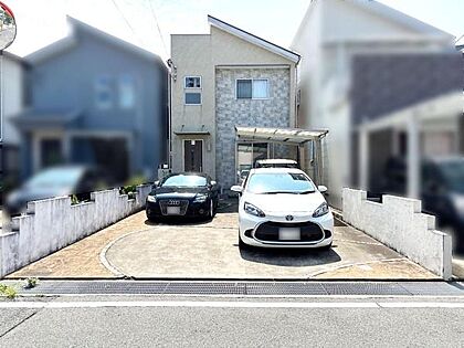 現地写真、日当たり良好な立地。駐車スペースも広く4台駐車可能、車の出し入れがしやすい設計です。角度の異なる屋根デザインが特徴的です。