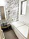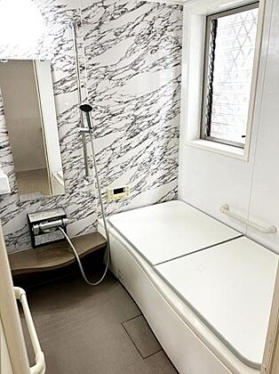 窓が取り付けられたバスルームは明るい印象です。壁面のデザインがスタイリッシュな空間を演出します。手すりやカウンター付きで使い勝手にも配慮されています。