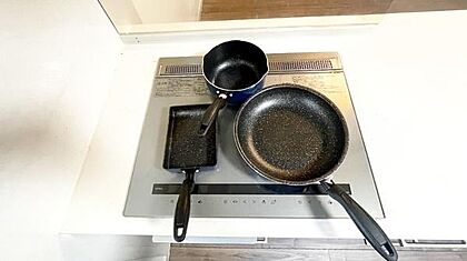 IHクッキングヒーターが設置されているキッチンです。フラットなスペースで掃除がしやすく調理器具も置きやすいです。