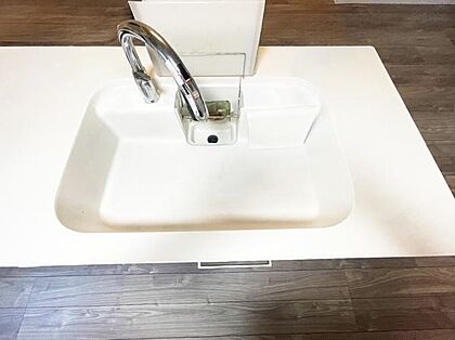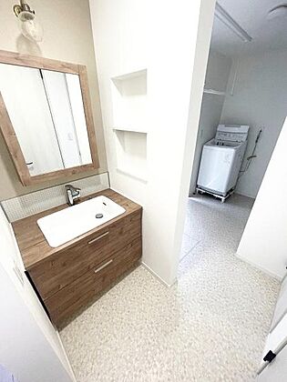 明るく清潔感のある木目調の洗面台が魅力です。収納付きで空間をすっきりと保てます。