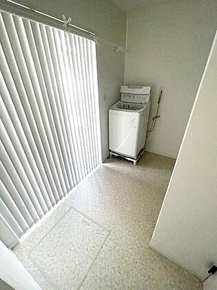 大きな窓から光が差し込む明るいランドリールームです。室内はゆとりのある空間です。床はお手入れしやすい素材です。