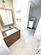 脱衣室には便利な可動式棚が設けられており小物やタオルの収納に役立ちます。浴室扉にはタオルを掛けることも可能です。床は明るい色調で清潔感があります。