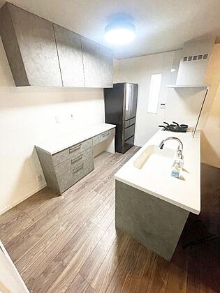 キッチン全体が明るく室内が広く感じられます。収納スペースが豊富で整理整頓しやすい設計です。シンプルなデザインが空間をすっきり見せています。床材の風合いがやさしく落ち着いた雰囲気も特徴的です。