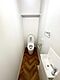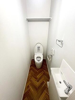 白を基調とした内装が明るい印象を与えます。ヘリンボーン柄のフローリングがアクセントになっています。手洗い器が備え付けられており機能的です。
