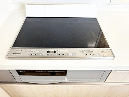 IHクッキングヒーターが設置されているキッチンです。フラットなスペースで掃除がしやすく調理器具も置きやすいです。