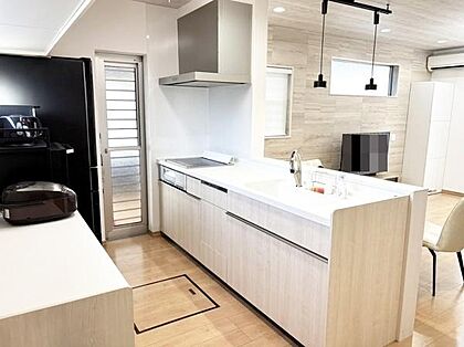 収納スペースがしっかり確保されています。作業スペースが広く調理がしやすい造りとなっています。換気設備も備わっています。