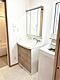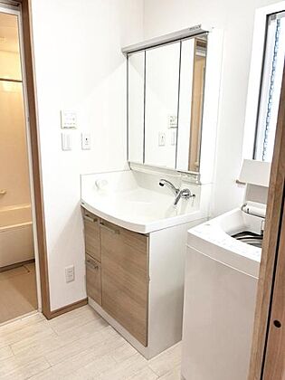 洗面台には鏡と収納スペースが備わっており日々の身支度に便利です。明るい採光が気持ちいい洗面スペースです。洗面所には洗濯機置き場もございます。