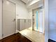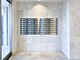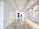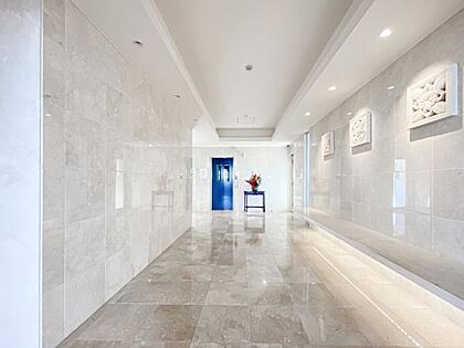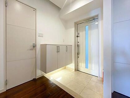 白い大理石から温もりのウォルナットへ。間接照明が迎える上質な玄関。