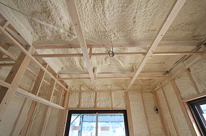 発泡ガスを吹き付ける工法のため、すき間が無く気密性が高いのが特徴。フォーム内部の99%が空気で超軽量なのに、高い断熱性能を発揮します。