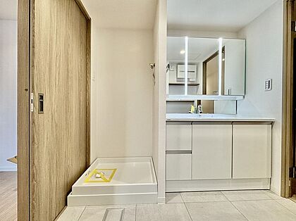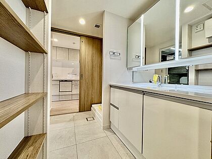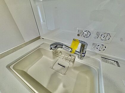 三面鏡にハンドシャワー付き、 使いやすい洗面台。
