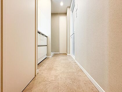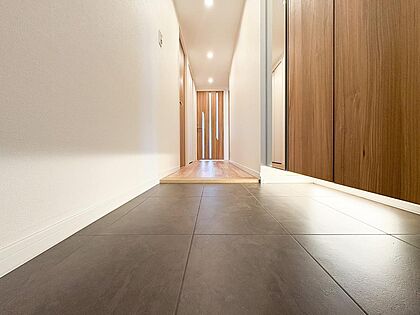 玄関スペースはシンプルでありながら上品なデザインが特徴。来客時にも好印象を与える清潔感があり、収納も備わっているため、靴や小物もすっきり片付けられる使い勝手の良い空間です。