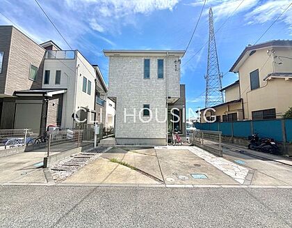 シンプルモダンな外観が特徴。前面道路は車通りが少なく、子育てにも安心です。