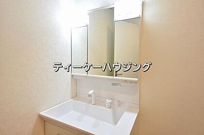 三面鏡の裏には収納がたっぷり。洗面室をすっきりきれいに使えます。