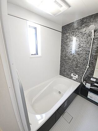 ゆったり入れる浴槽や、一坪サイズのゆとりの空間で床面に細かな排水溝を加工してあることで、乾きやすく、滑りにくく、汚れにくい仕様になっており、浴室換気乾燥暖房機も設置あり。(同社施工例)