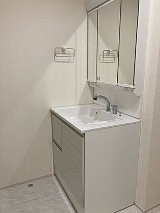 三面鏡の裏側に収納スペースを設置。化粧品や洗面小物などをすっきりと収納できます。(同仕様写真)