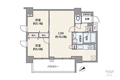 間取りは専有面積58.86平米の2LDK。LDK約16帖の縦長リビングのプラン。バルコニー面積は11平米です。