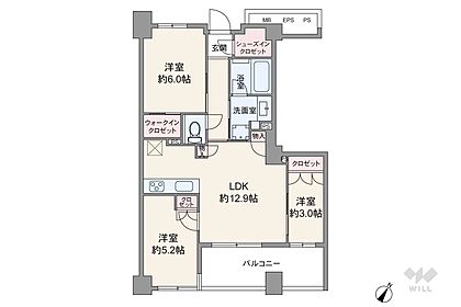 間取りは専有面積62.69平米の3LDK。全居室洋室仕様のプラン。バルコニー側の個室2部屋はLDKから出入りします。キッチンが奥まった位置にあり生活感が出にくい造り。
