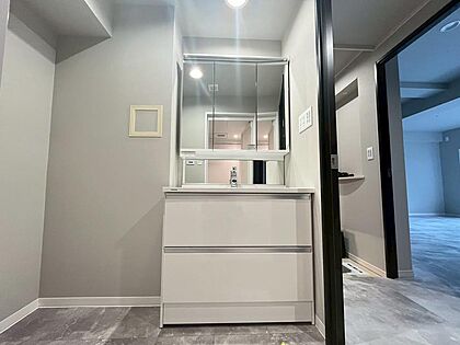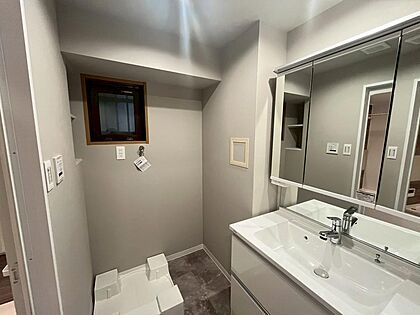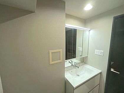 広い洗面所の三面鏡で、朝の身支度もスムーズです。