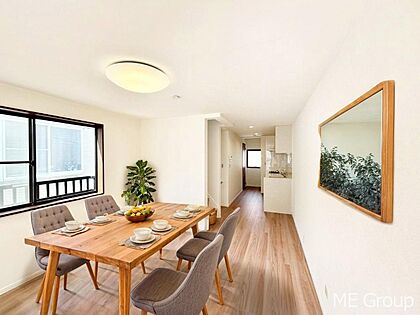 明るい陽光が注ぎ、寛ぎの雰囲気に満たされるリビング・ダイニング。