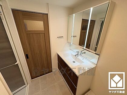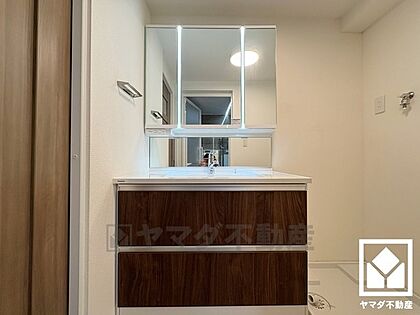 収納付きでスッキリお使い頂ける3面鏡の洗面台です。縦に2本配置されたLED照明が顔全体を明るく均等に照らしてくれるので、スキンケアやメイクがしやすくなります。