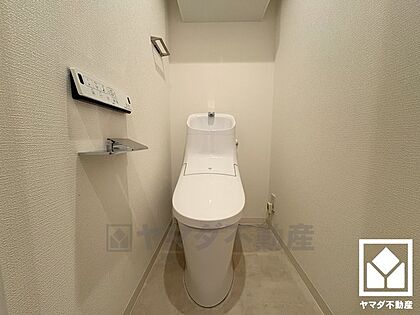 明るく清潔感溢れるトイレです。トイレットペーパーのストックや、消耗品置き場などとしてお使いいただける吊戸棚がございます。