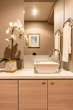 ※販売対象に家具・調度品は含まれません。清潔感のあるトイレ。吊戸棚や鏡、手洗い器が備わった、使い勝手の良い仕様です。