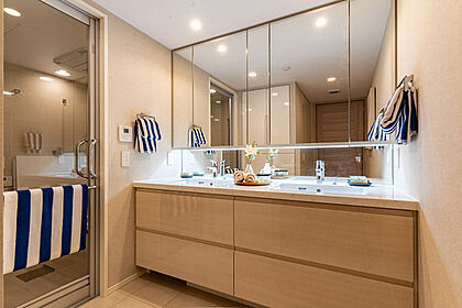 ※販売対象に家具・調度品は含まれません。並んで身支度ができる、ダブルボウルの洗面化粧台。洗面室内に2つの収納がございます。