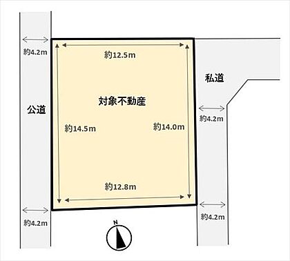 【接道】 二方 ( 公道 西 4.2m ) ( 私道 東 4.2m ) 私道負担/有 別途356m2 持分6分の1 |