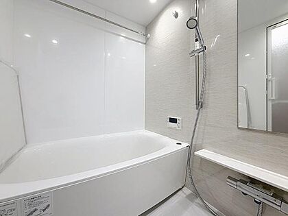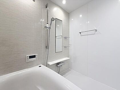 白を基調とした空間に落ち着いた壁面デザインが調和しています。壁付けの鏡や棚がすっきりと配置されており浴室内の収納も便利です。シャワーや浴槽の配置が機能的で快適な水回り環境を実現しています。