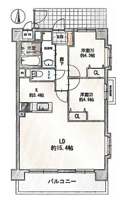 リビングダイニングが約15.4帖と広めに配置されております。2つの洋室にはそれぞれ収納スペースがあります。バルコニーへはリビングから直接出ることが可能です。