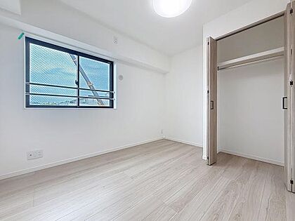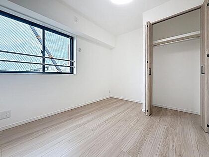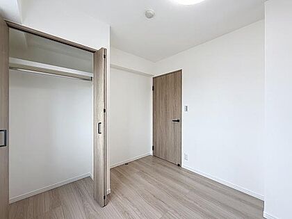 洋室は明るい色合いのフローリングが採用されシンプルで清潔感のある空間です。大きめのクローゼットがあり収納も便利です。窓からの採光で室内がより一層開放的に感じられます。