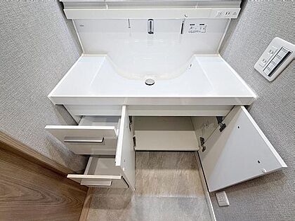 洗面所には複数の収納スペースが備わっており整理整頓がしやすい仕様です。シンプルなデザインでお手入れも楽々です。清潔感のある空間が広がっています。操作パネルも見やすく機能的です。