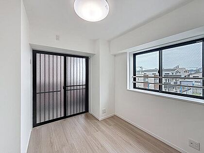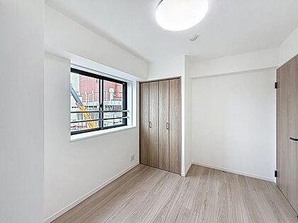 明るい光が差し込む洋室で清潔感のある空間です。窓が広く換気にも配慮されています。収納スペースも充実しておりすっきりと片付けやすい環境です。木目調の床が落ち着いた印象を与えます。