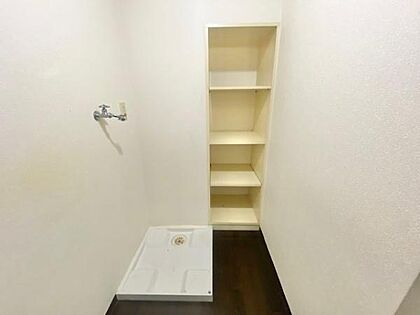 洗濯機置き場の横には洗剤などをしまえる棚があり便利!