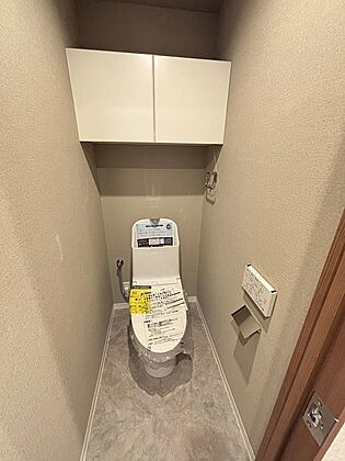 新品交換済、温水洗浄便座です。棚にはあらかじめ扉がついており、清掃用具等を生活感なく収納できます。