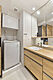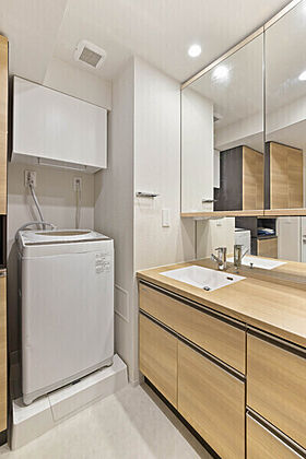 ※販売対象に家具・調度品は含まれません。身支度がしやすいゆとりのある洗面化粧台です。洗濯パンの上部には吊戸棚付きです。