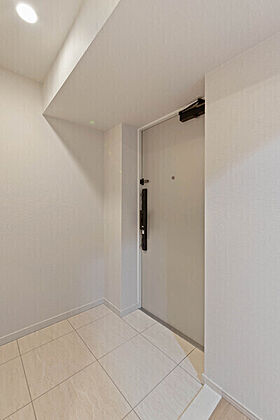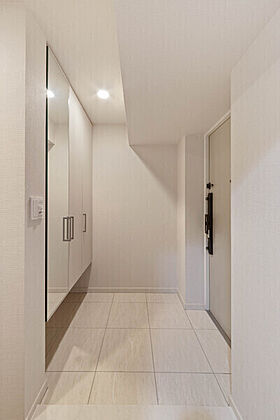 白を基調とした上品な玄関です。姿見付きの下足入が備わり、ご家族の靴をすっきりと片付けられます。【玄関】